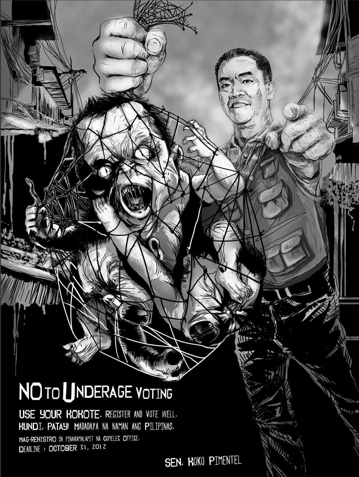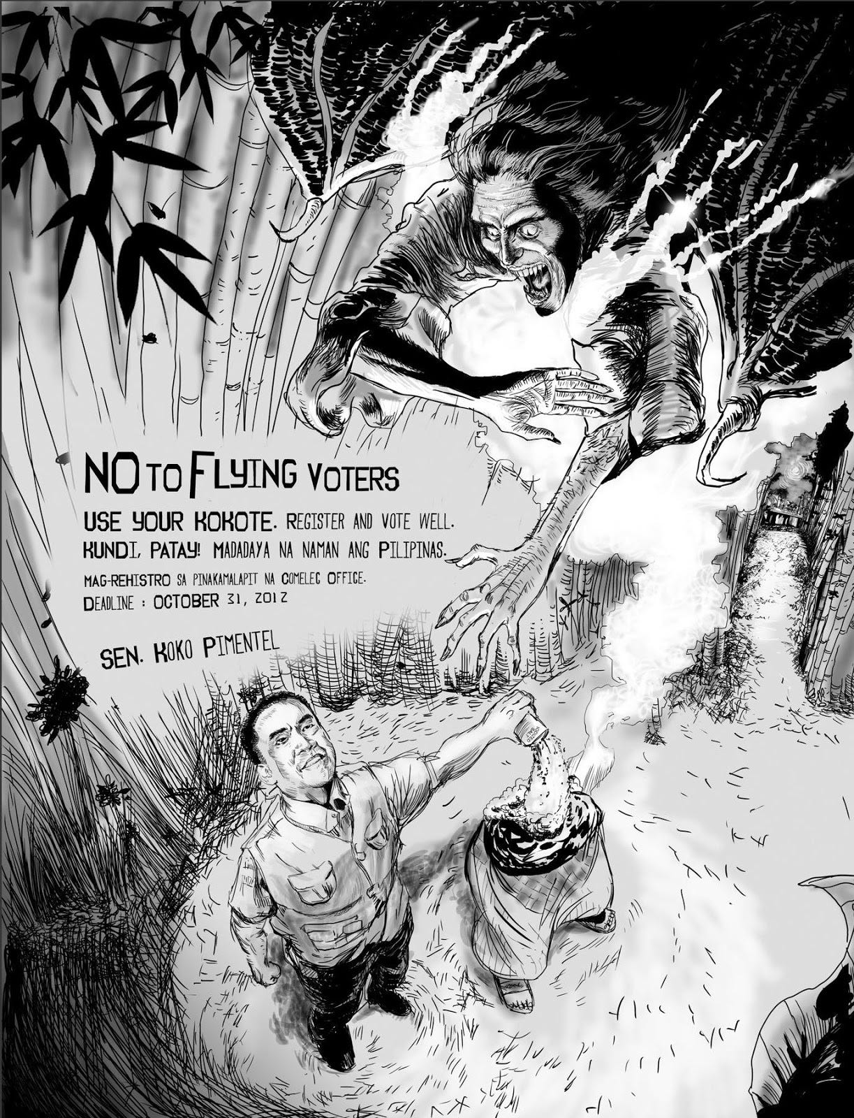 In the first illustration below, a man is pouring salt on the bottom half of the manananggal, which prevents the top half from reuniting with the bottom. This would cause ultimate death for the manananggal who must reunite with her bottom half before daylight breaks. The second one depicts a tiyanak caught in a net. What’s interesting here is that these images were used in a 2013 campaign by Sen. Koko Pimental to address voter fraud tactics in the Philippines. (Source: Ads of the World)