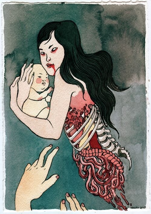 The second most horrifying ghoul of my childhood, will also bring about the second confession of this newsletter. I used be terrified of babies. Yes. Babies used to scare the shit out of me. I’m most sorry to my little cousins, Mark and Jeremy, and also my little brother, Alex, who bore the brunt of my fear that if I was left alone with them in a room they would turn into demons. (If you guys are reading this, I’m really sorry I thought you were the devil incarnate.) Most of this fear had to do with a Tagalog movie I watched in the late 80s called Tiyanak. In the Philippines, the tiyanak is thought to originate from a dead fetus, which then takes the shape of a new born baby or small child in need of help or saving. When the creature finds a victim they will shape shift into a vampire-like creature and suck their blood. The film follows the lore pretty closely as the main character, who is desperate to have a baby after many miscarriages, takes in a baby her sister found in the jungle. Guess what happens next?